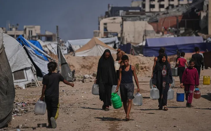 Người dân mang can nhựa và chai nước tại trại dành cho người sơ tán ở thành phố Gaza , ngày 23/10/2025 (Ảnh: AP)