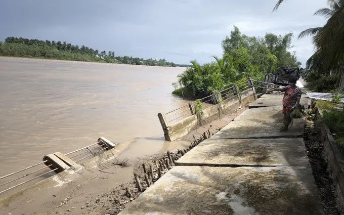 Sạt lở nghiêm trọng làm cho bờ kè chống xói lở rơi xuống sông.