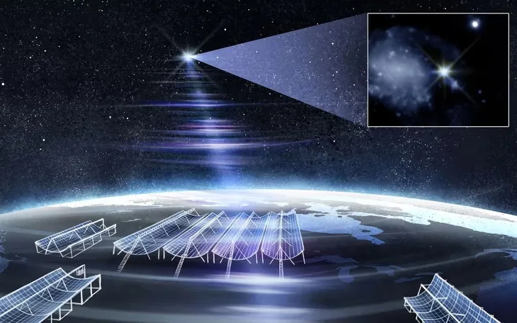 Minh họa của họa sĩ về hệ thống kính thiên văn Outrigger của CHIME truy vết RBFLOAT tới thiên hà chủ (Ảnh: MMT Observatory)