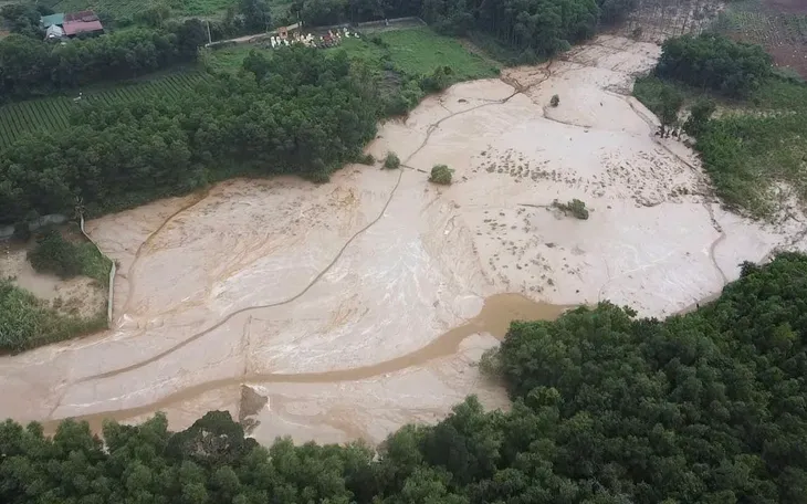 Tại hiện trường, một lớp bùn màu xám đục, đặc quánh đã chảy loang, bao phủ một vùng đất canh tác rộng lớn ở khu vực hạ lưu. Nhiều thửa ruộng, vườn cây và ao cá của người dân đã bị lớp bùn này tràn vào, phủ kín bề mặt. Lớp váng dày đóng lại, bốc lên mùi hóa chất nồng hắc, gây cảm giác khó thở.