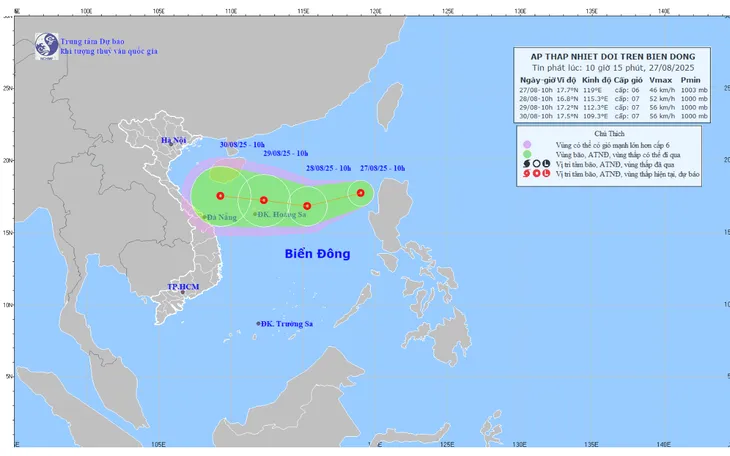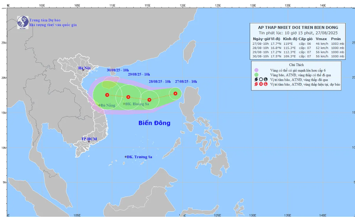 Đến 10 giờ ngày 28/8, áp thấp nhiệt đới cách đặc khu Hoàng Sa khoảng 410km về phía Đông với sức gió mạnh cấp cấp 6-7, giật cấp 9; di chuyển theo hướng Tây Tây Nam với tốc độ 15- 20km/h và có khả năng mạnh thêm. Khu vực chịu ảnh hưởng là vùng biển phía Đông khu vực Bắc Biển Đông. Cấp độ rủi ro thiên tai cấp 3.