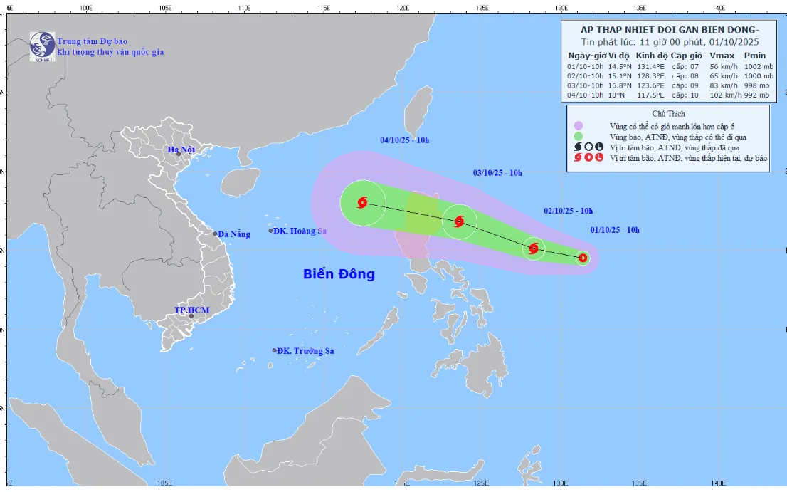 Hồi 10h ngày 1/10, vị trí tâm áp thấp nhiệt đới ở khoảng 14,5 độ Vĩ Bắc; 131,4 độ Kinh Đông, trên vùng biển phía Đông đảo Luzon. Sức gió mạnh nhất vùng gần tâm áp thấp nhiệt đới mạnh cấp 6 - 7 (39 - 61 km/h), giật cấp 9. Di chuyển theo hướng Tây Tây Bắc với tốc độ khoảng 15 km/h.