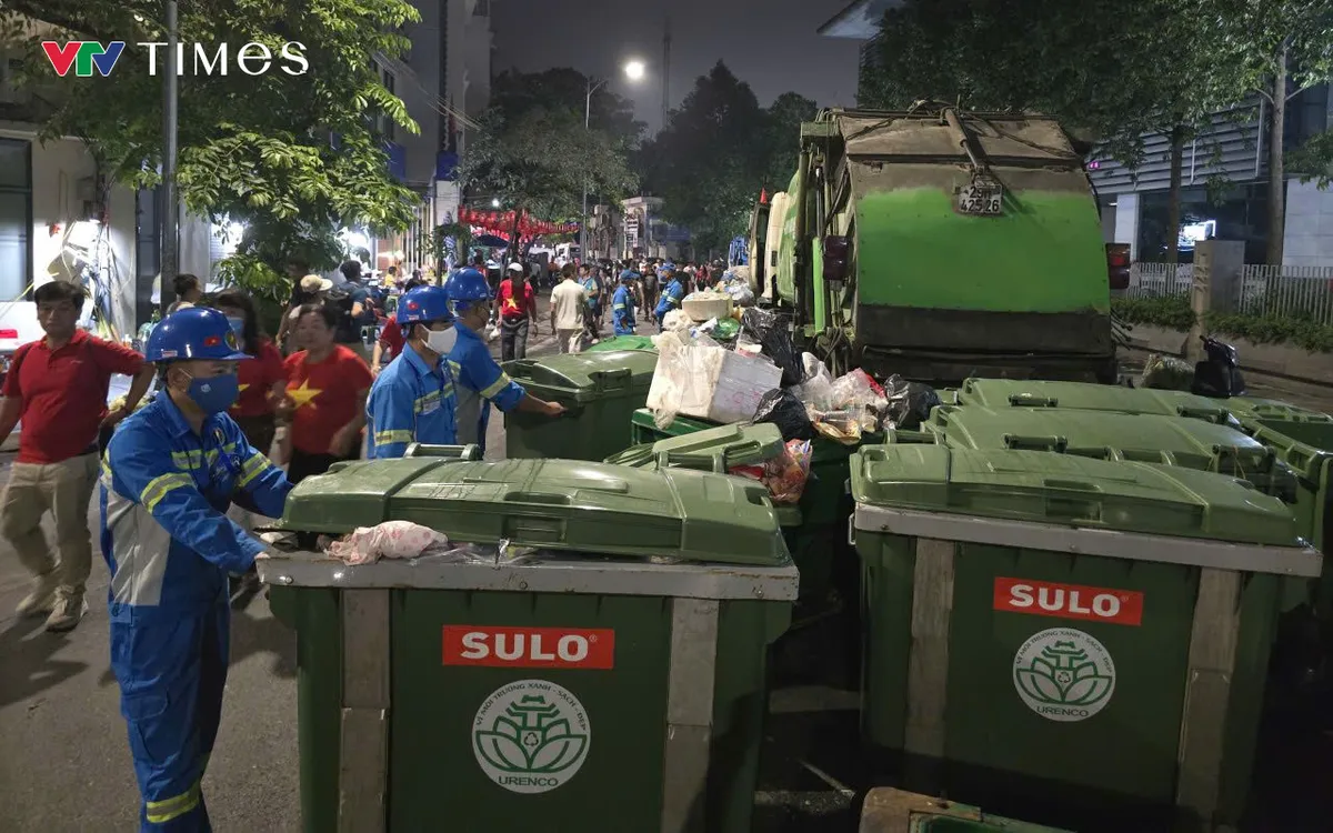 Hơn 2h sáng ngày 2/9, anh Nguyễn Kim Thành, Công ty cổ phần môi trường đô thị Sóc Sơn (đơn vị được điều động tăng cường đảm bảo môi trường trên địa bàn phường Ba Đình, Hà Nội) đã có mặt tại đường Ông Ích Khiêm. Trao đổi với phóng viên Thời báo VTV, anh Thành cho biết, anh làm theo ca từ 3h sáng đến 11h trưa. Những ngày gần đây lượng rác trên các tuyến đường anh đảm nhiệm khá là nhiều, nhất là những ngày hợp luyện, sơ duyệt, tổng duyệt và hôm nay chuẩn bị diễu binh, diễu hành 80 năm Cách mạng tháng Tám thành công và Quốc khánh 2/9 vào sáng ngày mai, người dân hội tụ về khu vực này rất đông, lượng rác lên đến 3 đến 4 xe tải mỗi ngày, chúng tôi phải hoạt động hết công suất.